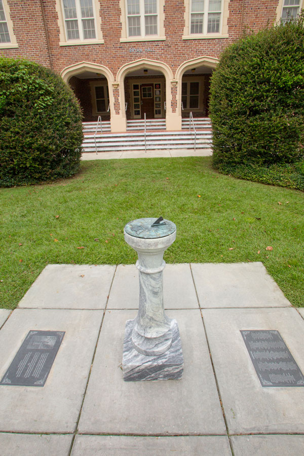 Just outside Bryan Hall (facing Convocation), be sure to look for a marble and bronze sundial. A gift from the 1917 freshman class, it was nearly destroyed when thrown in a trash heap during a construction project. The sundial had weathered significantly and looked like little more than an old concrete pillar. Thanks to John Raulerson, an FSU outdoor amenities expert and sculptor, the piece was salvaged. This piece of history names the students who presented the sundial to their beloved school during a time of national strife. “It was given right after Woodrow Wilson entered World War I,” explained Raulerson, who spent hours researching the sundial’s history and original inscription: “We will count none but our sunny hours.”