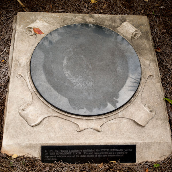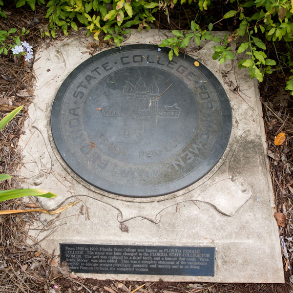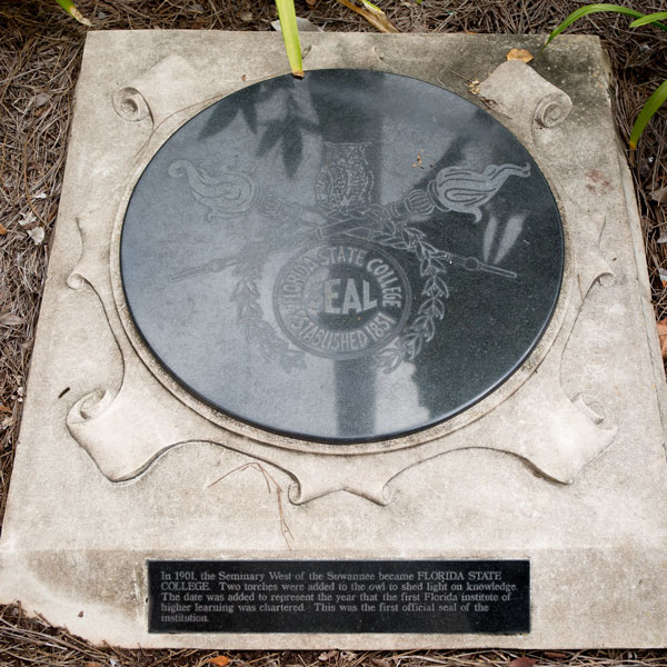 The Historic School Seals Monument, donated by the Senior Class of 2000 and Senior Class Council of 2000 (part of the Student Government Association) and created by artisans in the Master Craftsman Studio, is comprised of three flag poles on which fly the flags of the United States of America, the State of Florida, and Florida State University. The large black granite seals at the bases of the flags are representative of the West Florida Seminary, the Florida State College, and the Florida State College for Women. A smaller granite plaque reflects the modern seal for Florida State University. Each seal portrays the school message and its vision of the future. The seal of the West Florida Seminary (1851-1901), the first school on campus, displays the owl, which represented wisdom. The next seal, belonging to Florida State College (1901-1905), kept the owl, now representing knowledge. The owl is flanked by two torches, which are meant to represent the college’s role as an illuminator of knowledge. The seal of the Florida Female College, later renamed the Florida State College for Women (1905-1947), removes the owl and adds a third torch. The motto of the college, Vires, Artes, Mores, is also added. These three torches reflected the goals in preparing the female students physically, mentally and morally. With these accomplished, the students could become Femina Perfecta or complete women. These torches continue in the university’s seal, representing the highest ideals for both men and women. The monument is representative of 164 continuous years of service in education.