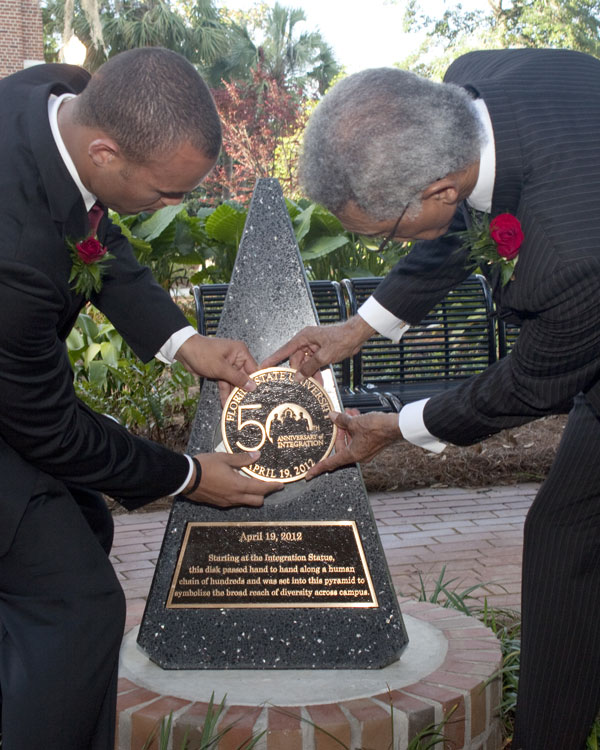 On April 19, 2012, Florida State University celebrated 50 years of campus integration by joining the hands of over 1800 students, faculty, staff, alumni, community leaders and special guests in a Hand in Hand Across Time ceremony. Radiating from the Integration Statue on Woodward Plaza, three human lines reaching to the east, south and west of the statue signified unity of persons and place throughout the decades. A plaque was passed from Integration hand-to-hand to its final resting place in a permanent marker. There are three of these commemorative pylons: one at the north side of Westcott Plaza between Westcott and the College of Criminology and Criminal Justice Building, one at the corner of Call Street and Stadium Drive adjacent to the College of Medicine, and one at the corner of Woodward Avenue and Jefferson Street.