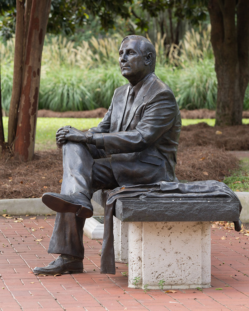 Installed on the south side of Westcott Plaza and unveiled in January of 2010, sits a life-sized bronze statue of FSU’s 13th President, T. K. Wetherell, sculpted by husband and wife team Bob and Melinda Copper. President Wetherell served as the university’s president from 2003 until 2009. A triple alumnus, Dr. Wetherell attended FSU on a football scholarship and played from 1963 to 1967. He earned a bachelor’s degree in social studies and master’s degree in education in 1967 and 1968, respectively, and in 1974, received a doctorate in education administration. Dr. Wetherell was a member of the Florida House of Representatives from 1980 to 1992, and Speaker of the House in 1991 and 1992. He served as President of Tallahassee Community College from 1995 to 2001 and also served as President of The Independent Colleges and Universities of Florida (ICUF).